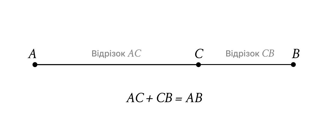 Відрізок — частина прямої, обмежена двома точками. Його довжина завжди є додатним числом. Якщо точка лежить між та , то .