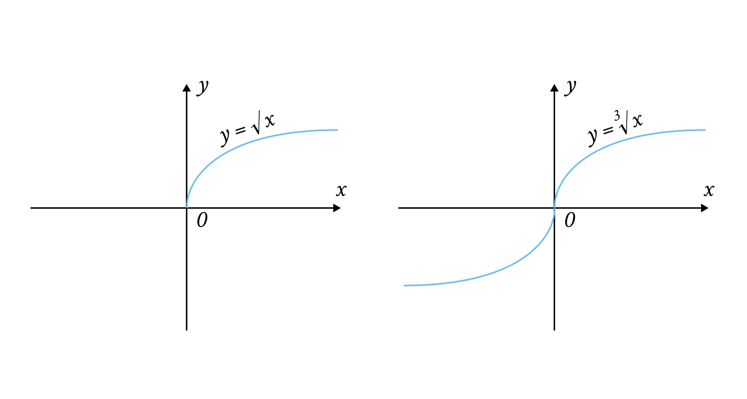 Коренева функція (): При парному (наприклад, ) функція визначена тільки для , а графік — вітка параболи, що лежить «на боці»; при непарному , функція визначена для всіх , а графік — симетричний відносно початку координат.
