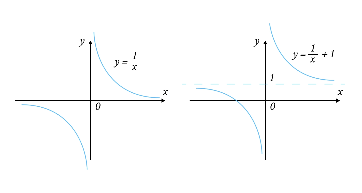 Обернена пропорційність (): Графік — гіпербола. Осі координат виступають асимптотами — лініями, до яких графік наближається, але ніколи їх не торкається.
