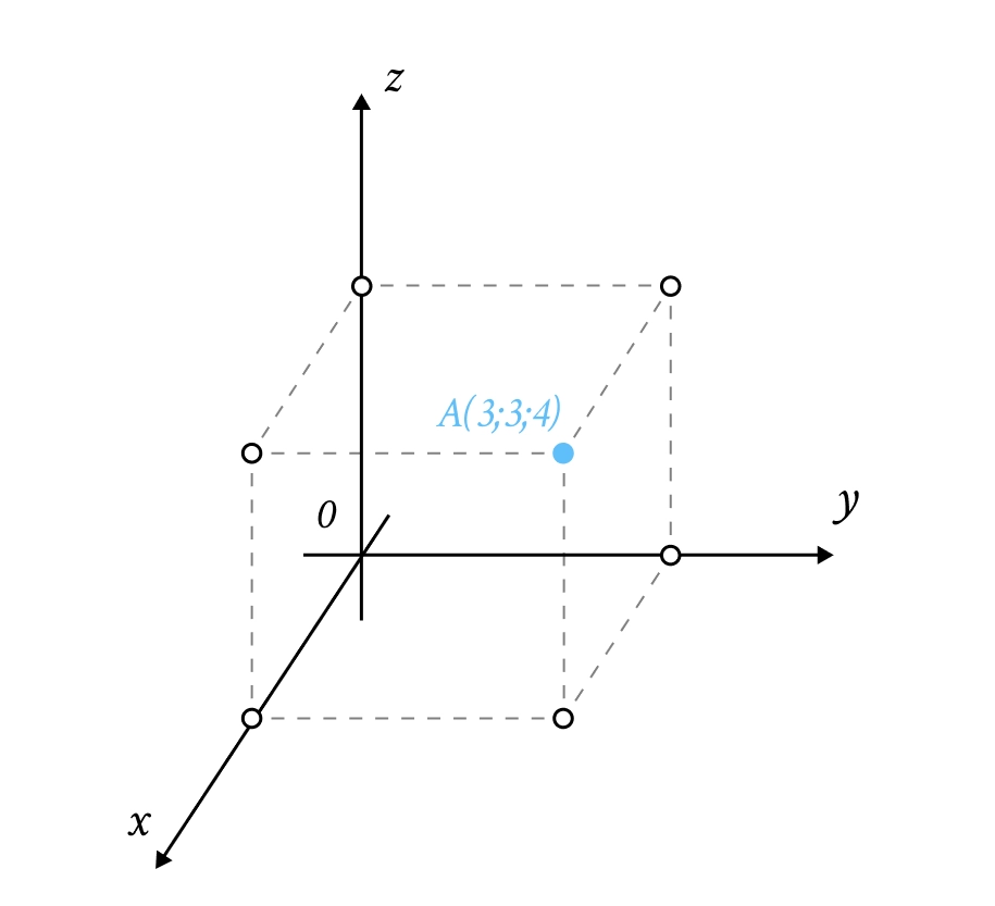 У стереометрії для опису положення об'єктів використовується тривимірна система координат. До осей Ox (абсцис) та Oy (ординат) додається третя вісь — Oz (вісь аплікат), що перпендикулярна до площини .