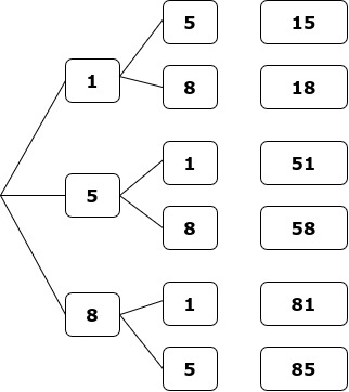 Скільки різних двозначних чисел можна скласти з цифр 1, 5 і 8, якщо кожну цифру використовувати у числі тільки один раз?