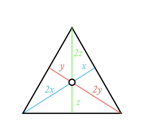 Медіана: Сполучає вершину з серединою протилежної сторони. Усі три медіани перетинаються в одній точці (центроїді), яка ділить кожну медіану у відношенні 2:1, починаючи від вершини.